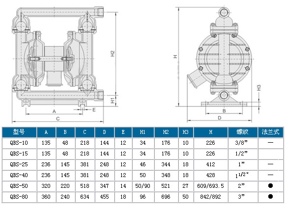QBS新型不锈钢气动隔膜泵 既能抽送流动的液体,又能输送一些不易流动的介质,具有自吸泵、潜水泵、屏蔽泵、泥浆泵和杂质泵等输送机械的许多优点: